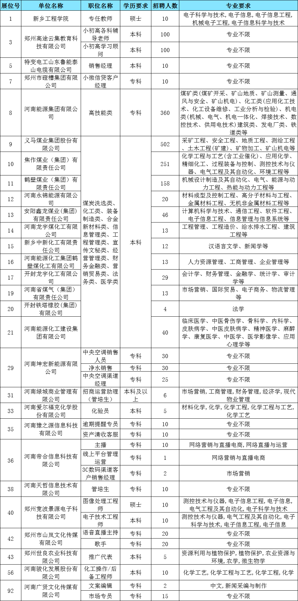 河南能源集团有限公司、郑州高途云集教育科技有限公司、新乡工程学院、特变电工山东鲁能泰山电缆有限公司、河南骏化发展股份有限公司等用人单位到场招聘,用人单位持续报名中,部分职位详情如下: