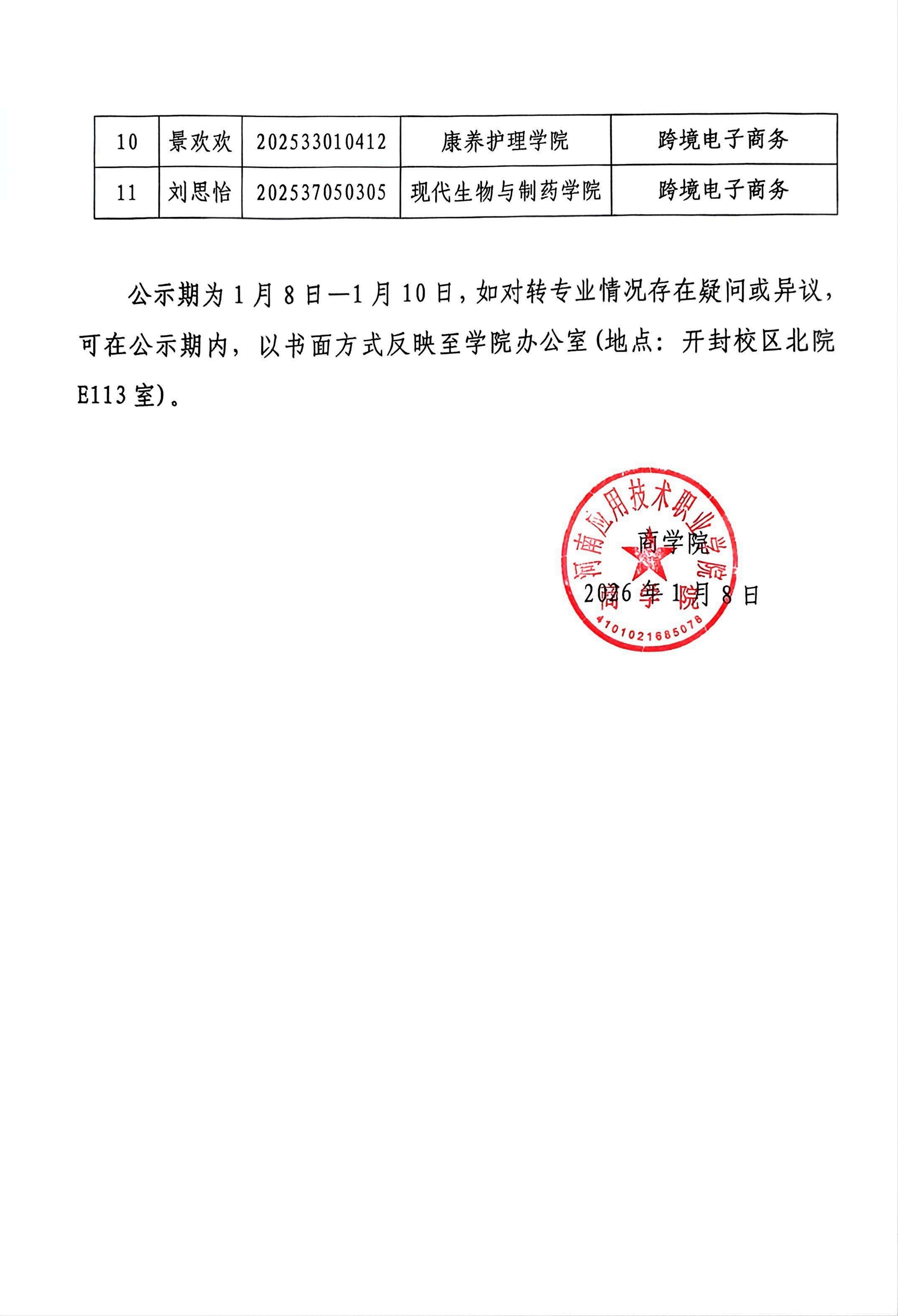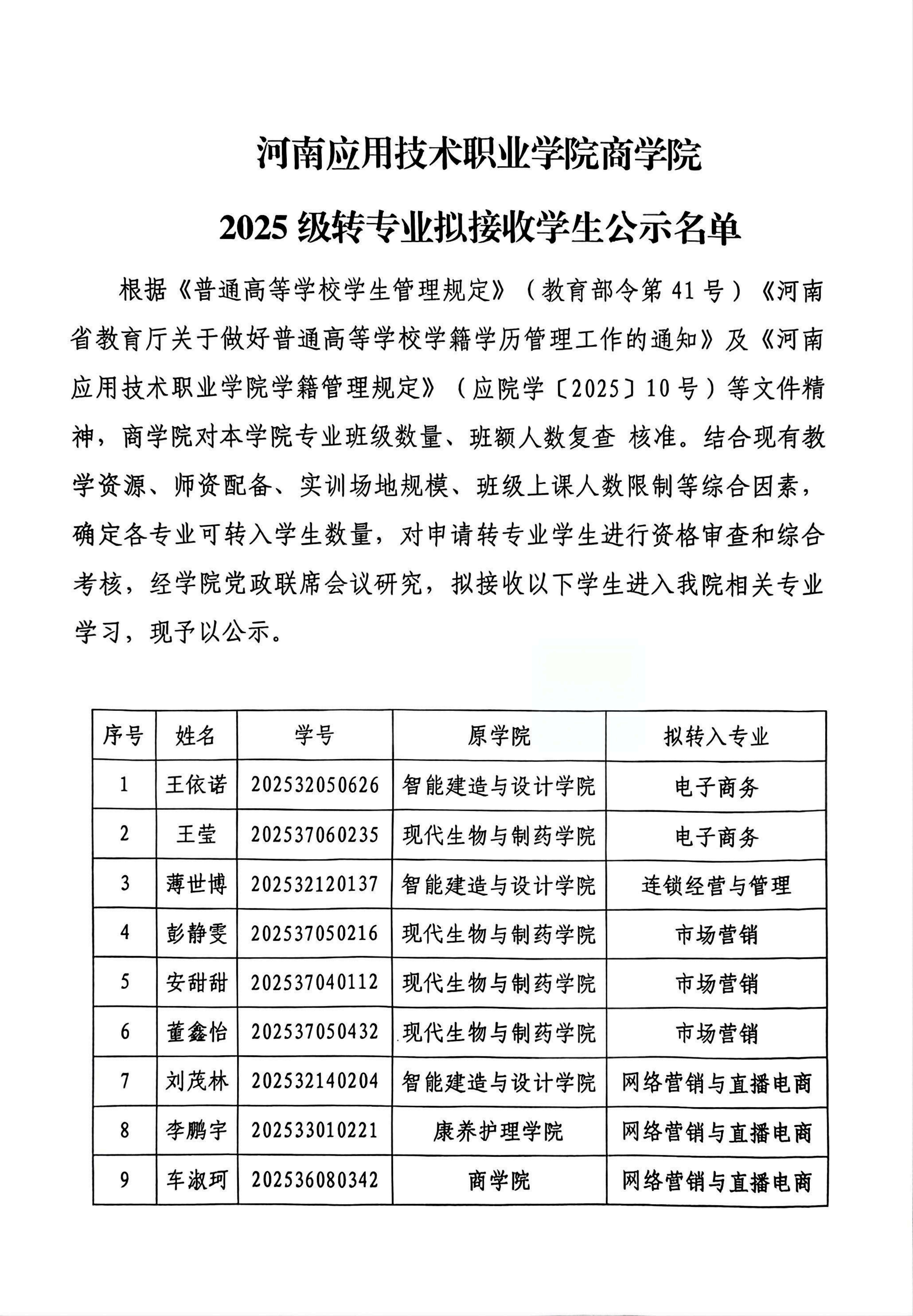 河南应用技术职业学院商学院 2025级转专业拟接收学生公示名单