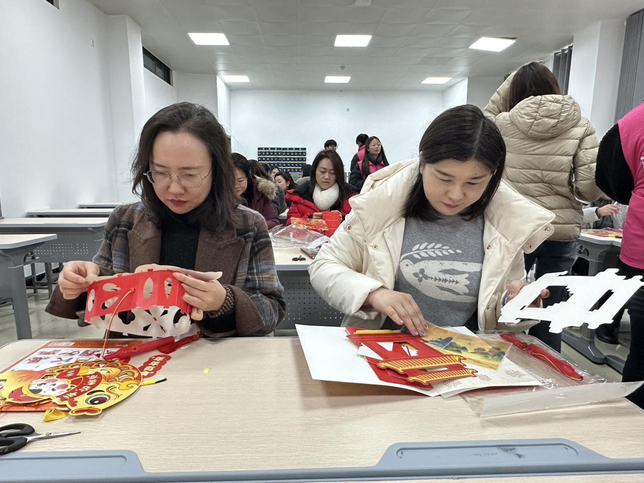 在手工制作环节,党员教师们热情高涨、分工协作。大家围坐在一起,裁剪、粘贴、组装、装饰,亲手制作一盏盏寓意吉祥的元宵花灯。现场欢声笑语、暖意融融,老师们在交流协作中增进情谊,在动手实践中感受民俗魅力,让传统节日更具仪式感与教育意义。