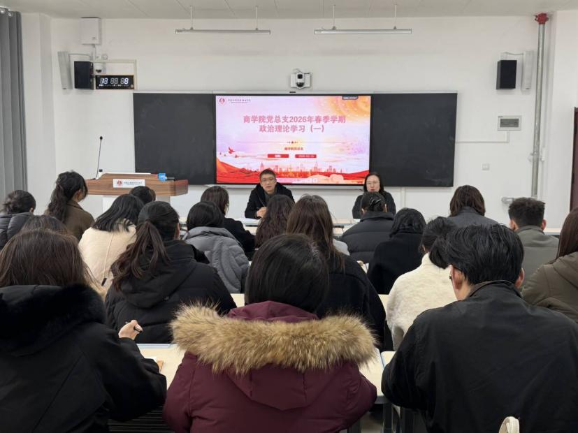 2026年3月10日,商学院党总支在B109教室召开政治理论学习。会议由商学院党总支书记荆伟科主持,院长王珂、副院长刘嘉慧及全体教师参加会议。