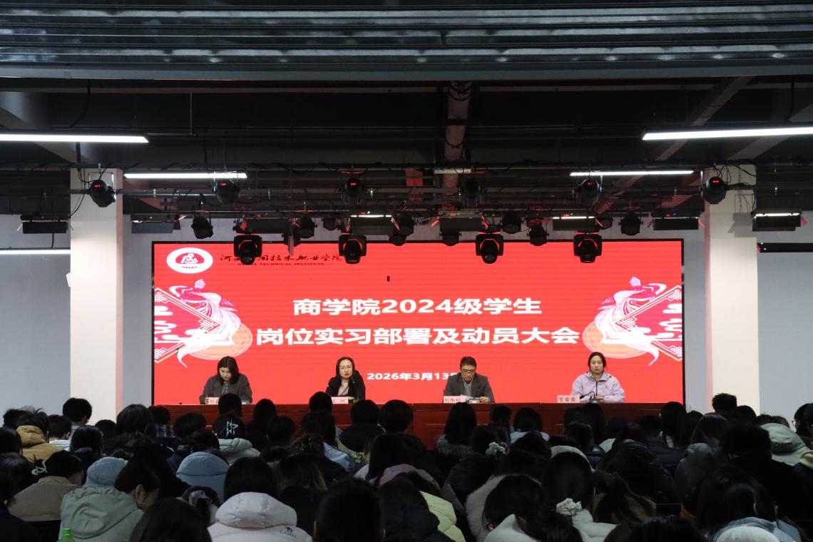 为扎实推进2024级学生岗位实习工作,帮助学生认清就业形势、合理规划实习安排,2026年3月13日,商学院在开封北院校区学生活动中心召开2024级学生岗位实习部署及动员大会。商学院院长王珂、党总支书记荆伟科、副院长刘嘉慧、团总支书记贺苗苗出席会议,辅导员及2024级全体学生参会,会议由刘嘉慧主持。