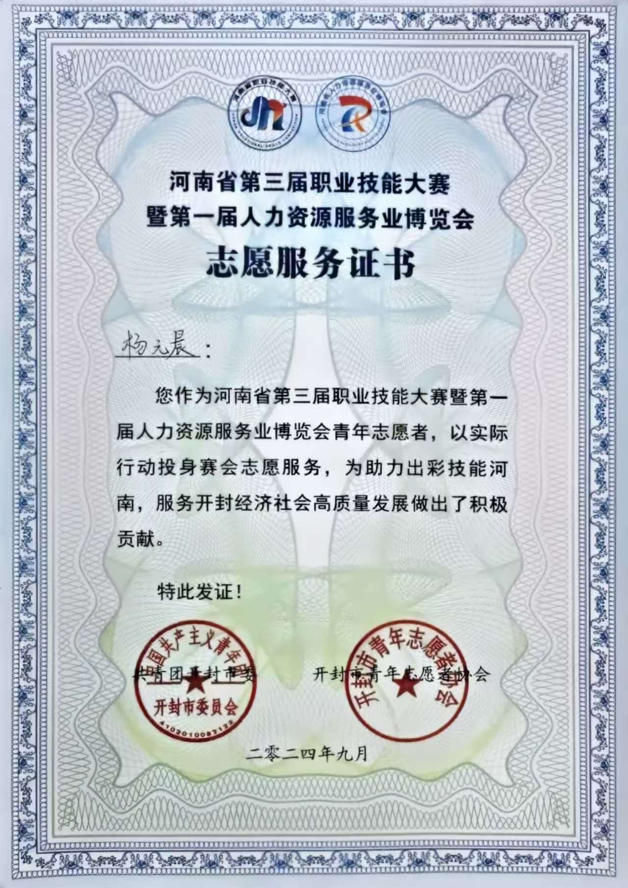 杨元晨同学作为共青团员,思想上积极进步,热爱祖国,始终认真学习党的理论知识,自觉践行社会主义核心价值观。2022-2024年获得“优秀共青团员”荣誉,她深知“小我融入大我”的道理,主动投身于各项志愿服务中,高中起,志愿服务贯穿了她的学习生涯:从2021年“致敬戍边英雄王焯冉”活动、“防溺水安全系列教育”、“禁烟,我们在行动”,到2022年“不忘初心学雷锋”、“抗击疫情,志愿同行”,再到2023年的“植绿护绿,创建绿色家园”、“向雷锋学习,树校园新风”,特别是漯河市青志协会举办的“儿童安全生存训练”,她先后6次前往留守儿童学校,为留守儿童带去安全知识讲座与趣味活动,烈日炎炎,哪怕被晒伤也没有停止前行的脚步,依旧坚守在自己的知识岗位上。进入大学后,她的志愿脚步未曾停歇:2024-2025年“应尽全力,志愿同行”博览会开幕式、“献血服务志愿者”、“河南省第三届职业技能大赛”等活动中,都能看到她专注志愿服务的身影。