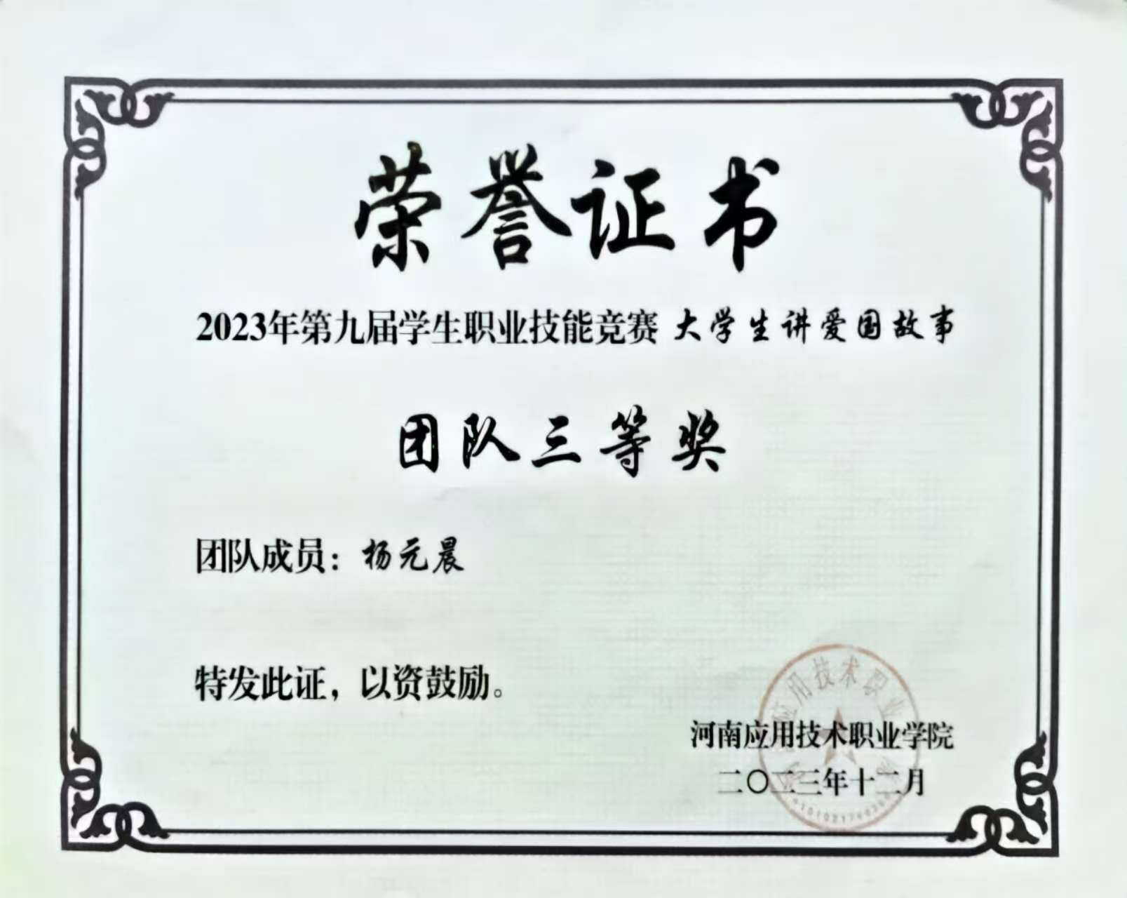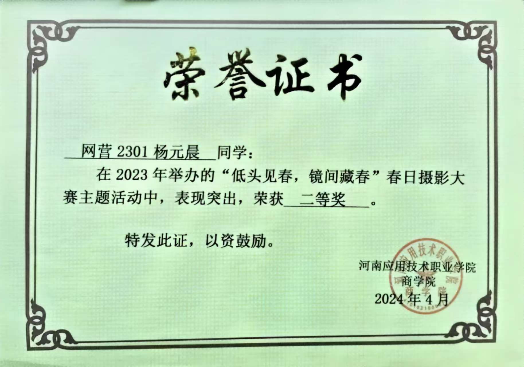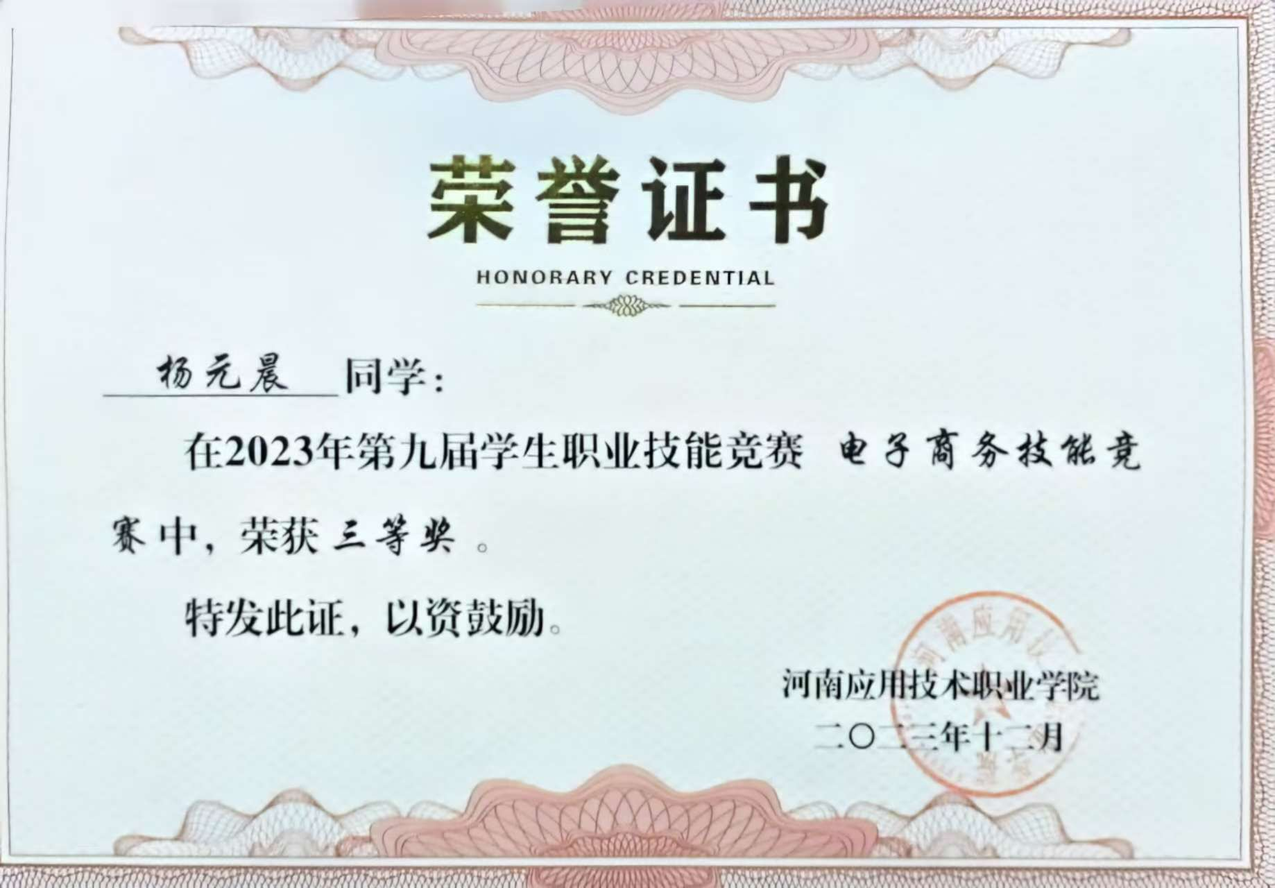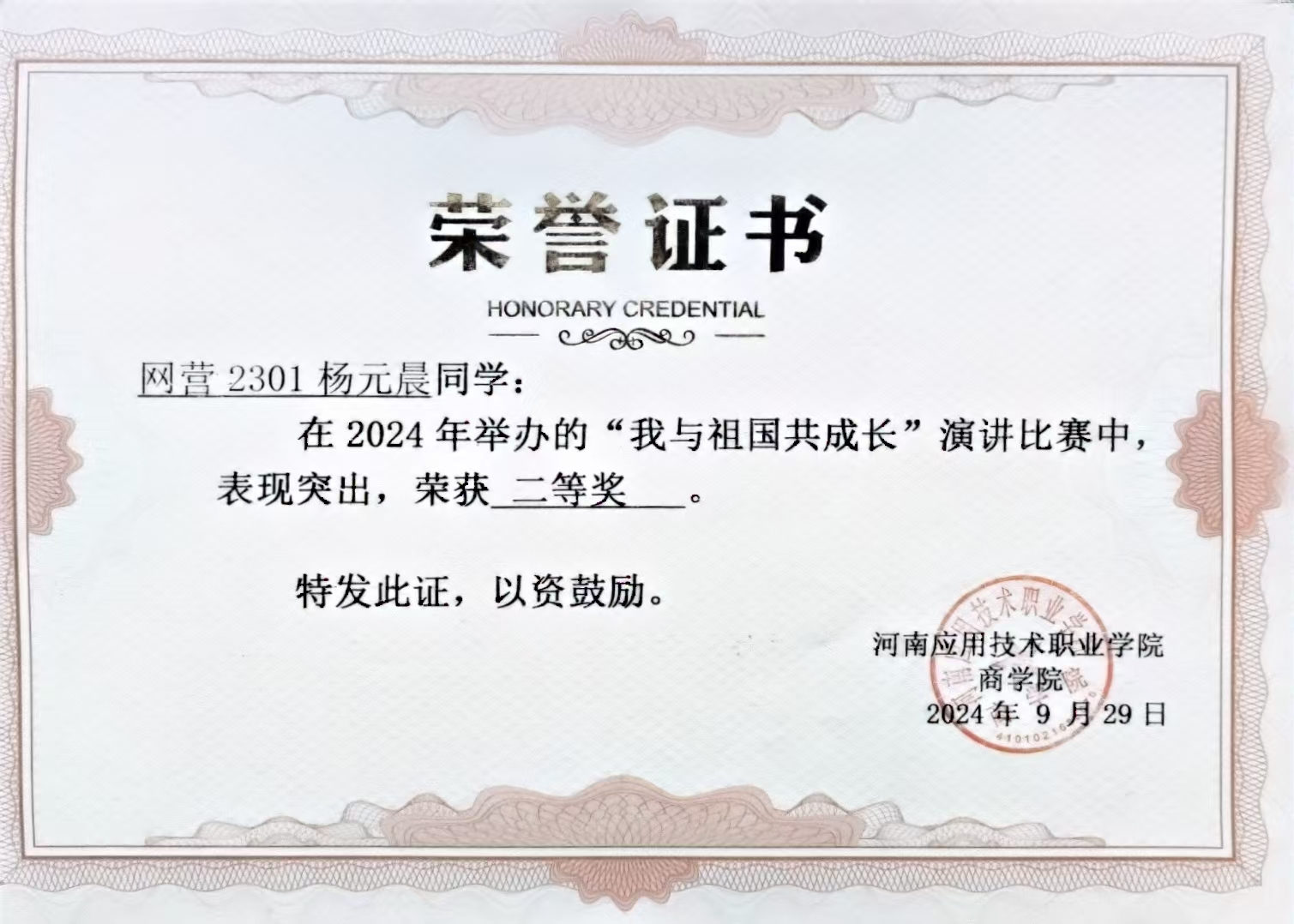 个人简介:共青团员,为河南应用技术职业学院,网络营销与直播电商2301班的学生。现为班级团支书、学校校团委青年宣传部部长、电子商务协会副会长,在校期间获得双创比赛省银奖1项,挑战杯省银奖3项、铜奖1项,职规赛省铜奖1项,校级院级奖项若干;发布论文1篇、专利1项;参与省级、校级、院级等志愿服务。