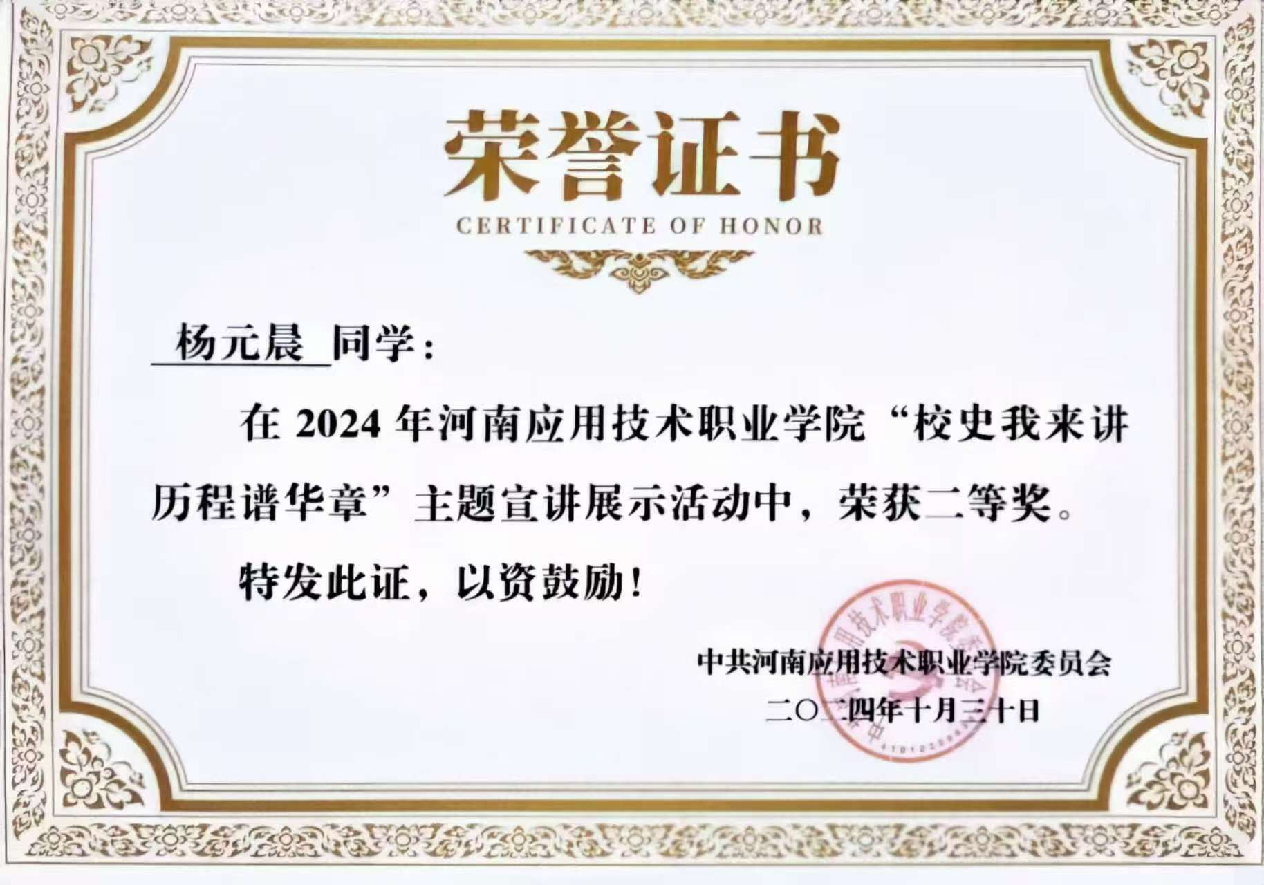 作为一名学生,杨元晨深知学业是本分。她的努力结出了丰硕的果实:学年量化评分高居班级榜首,综合成绩位列班级第二。她的学习成果远不止于课堂成绩,2024年取得国家励志奖学金,也通过自己的努力考取了“中级电子商务师”“1+X呼叫中心客户服务”“二级甲等普通话”等职业技能证书;同时在技能竞赛方面,也取得了一些相应的成绩,“挑战杯大学生创业竞赛”省级银奖4项,“中国国际大学生创新大赛”省级银奖1项,“职业生涯规划大赛”省级铜奖“电子商务技能竞赛”校级三等奖等;在文化素养和表达能力方面,杨元晨同学同样出色,经过不懈努力,她成功斩获“文明风采经典诵读比赛”省级银奖、“校史我来讲,历程谱华章”校级二等奖等。