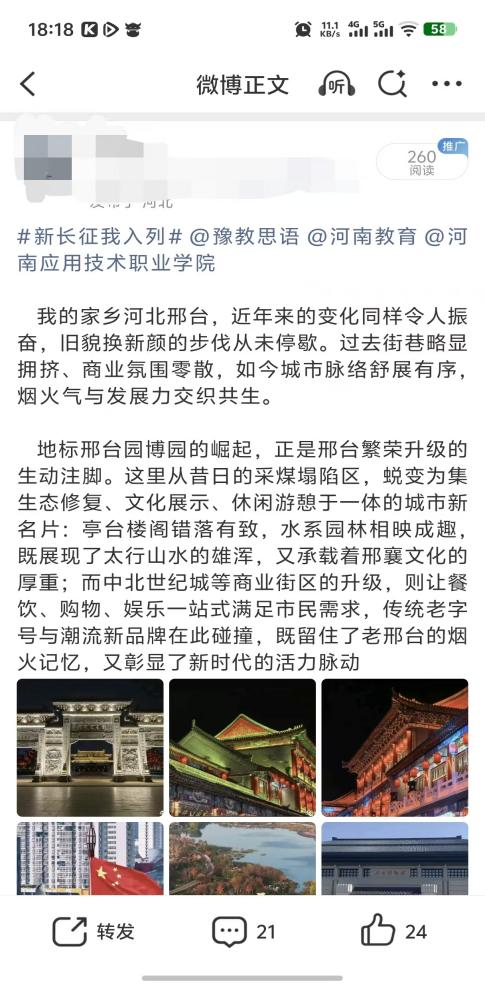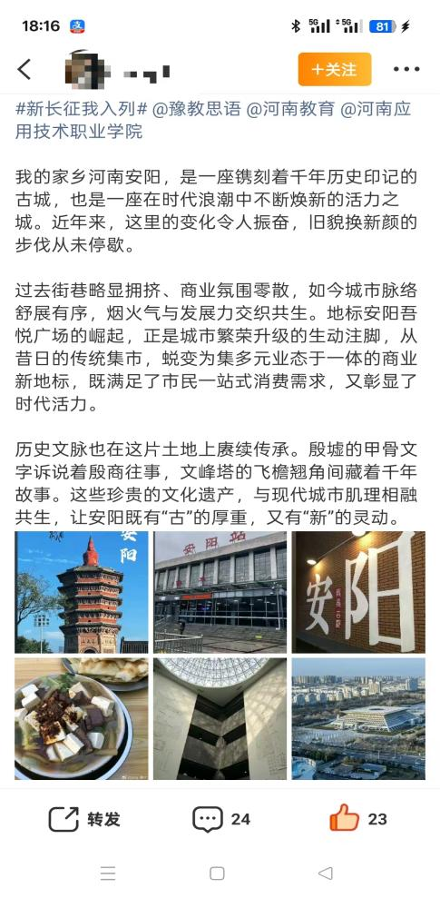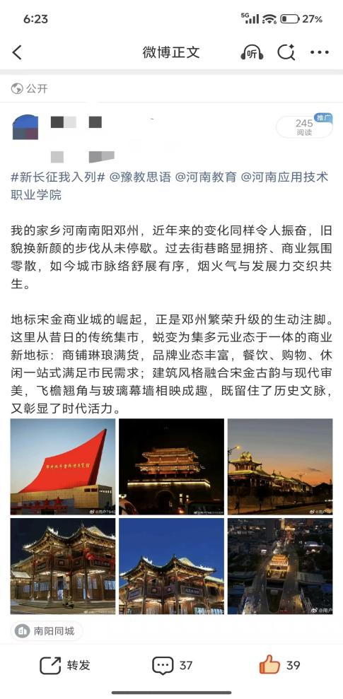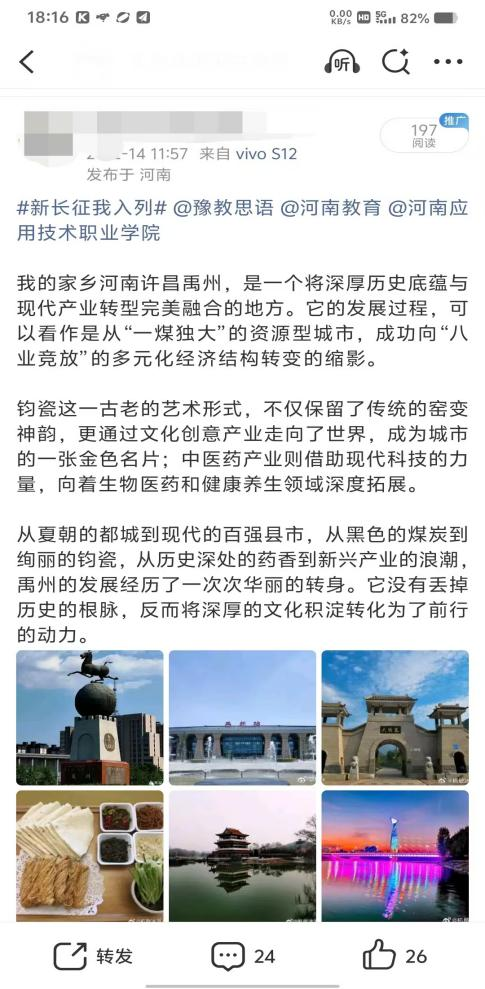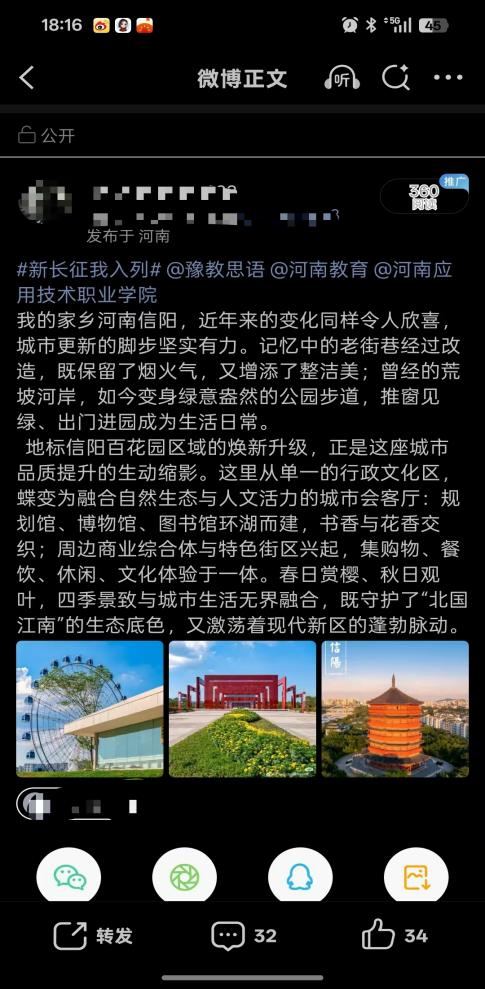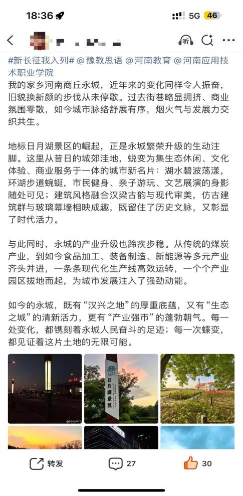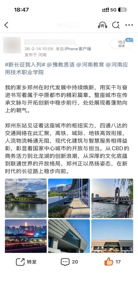 山河壮丽,岁月如歌。为引导商科学子在躬身实践中探寻中原发展的时代脉搏,将爱国情、强国志、报国行自觉融入新时代新征程,商学院精心组织开展了“牢记嘱托践使命 行走中原看巨变”主题思政教育实践活动。商院学子们积极利用网络平台,参与“青春共行:看中原新变”话题互动,用鲜活的影像与真挚的文字,描绘出一幅幅中原大地日新月异的生动画卷,让青春的正能量在网络空间澎湃激荡。