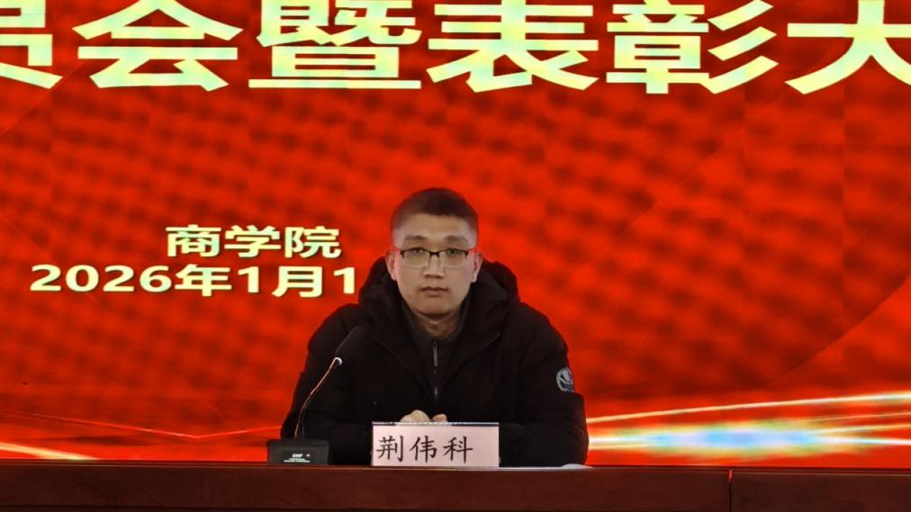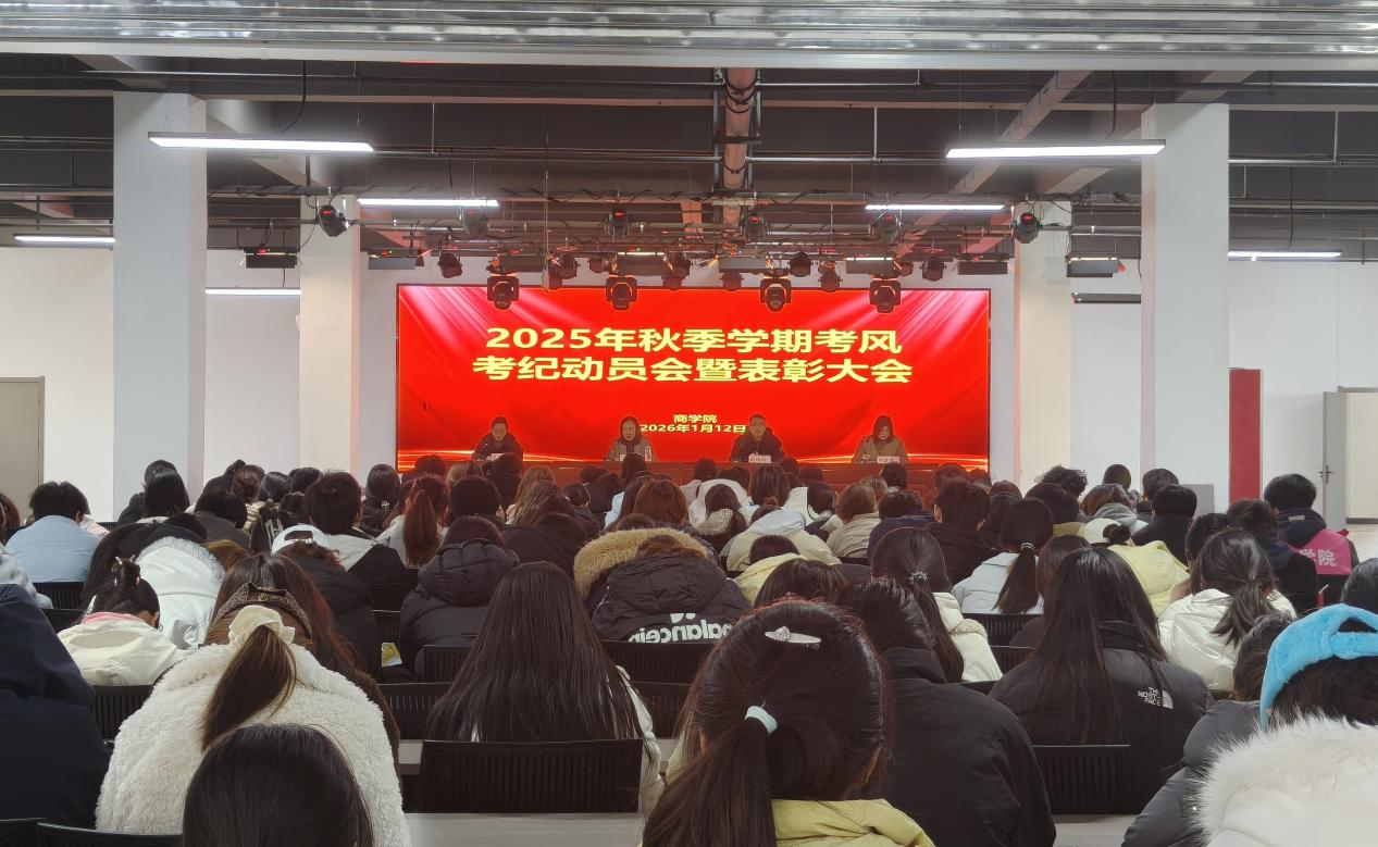 为深入落实立德树人根本任务,弘扬优良学风校风,强化学生诚信应考意识,1月12日,商学院在开封校区北院学生活动中心召开2025年秋季学期考风考纪动员会暨表彰大会。商学院党总支书记荆伟科、院长王珂,副院长刘嘉慧、全体专兼职辅导员及2025级全体学生参会。