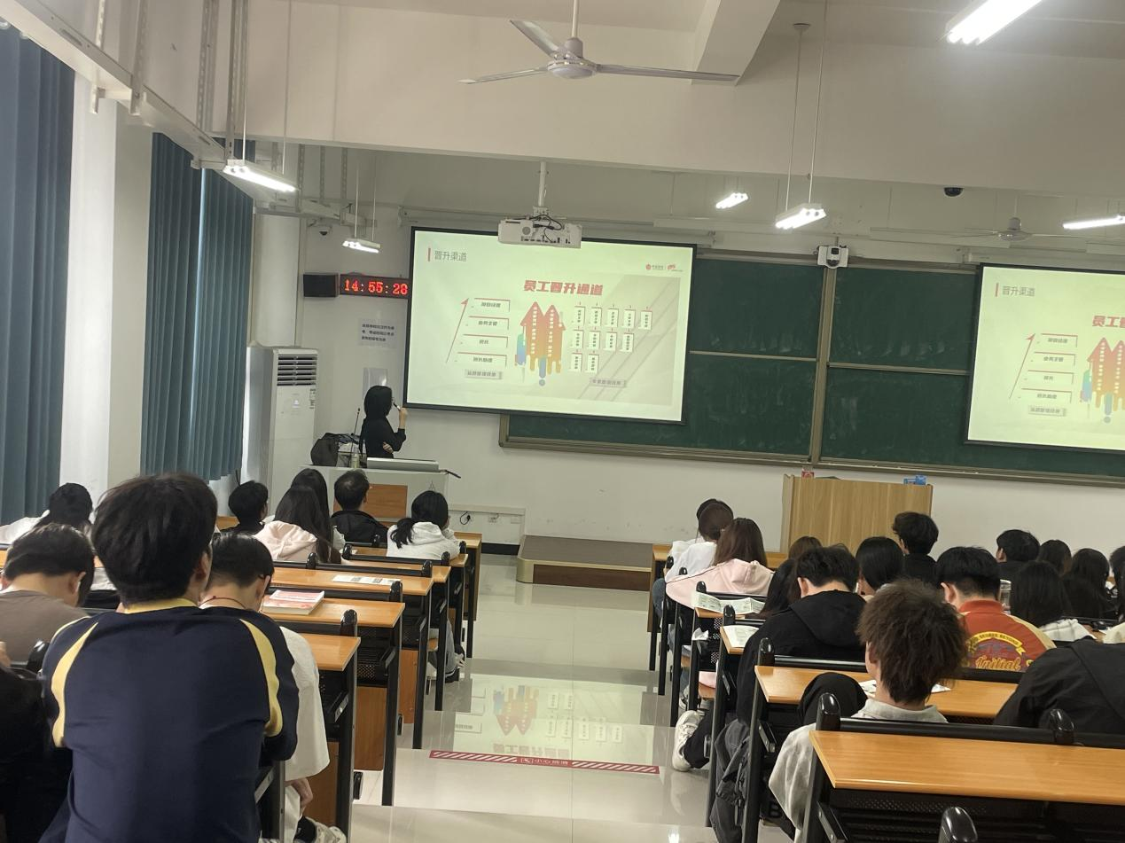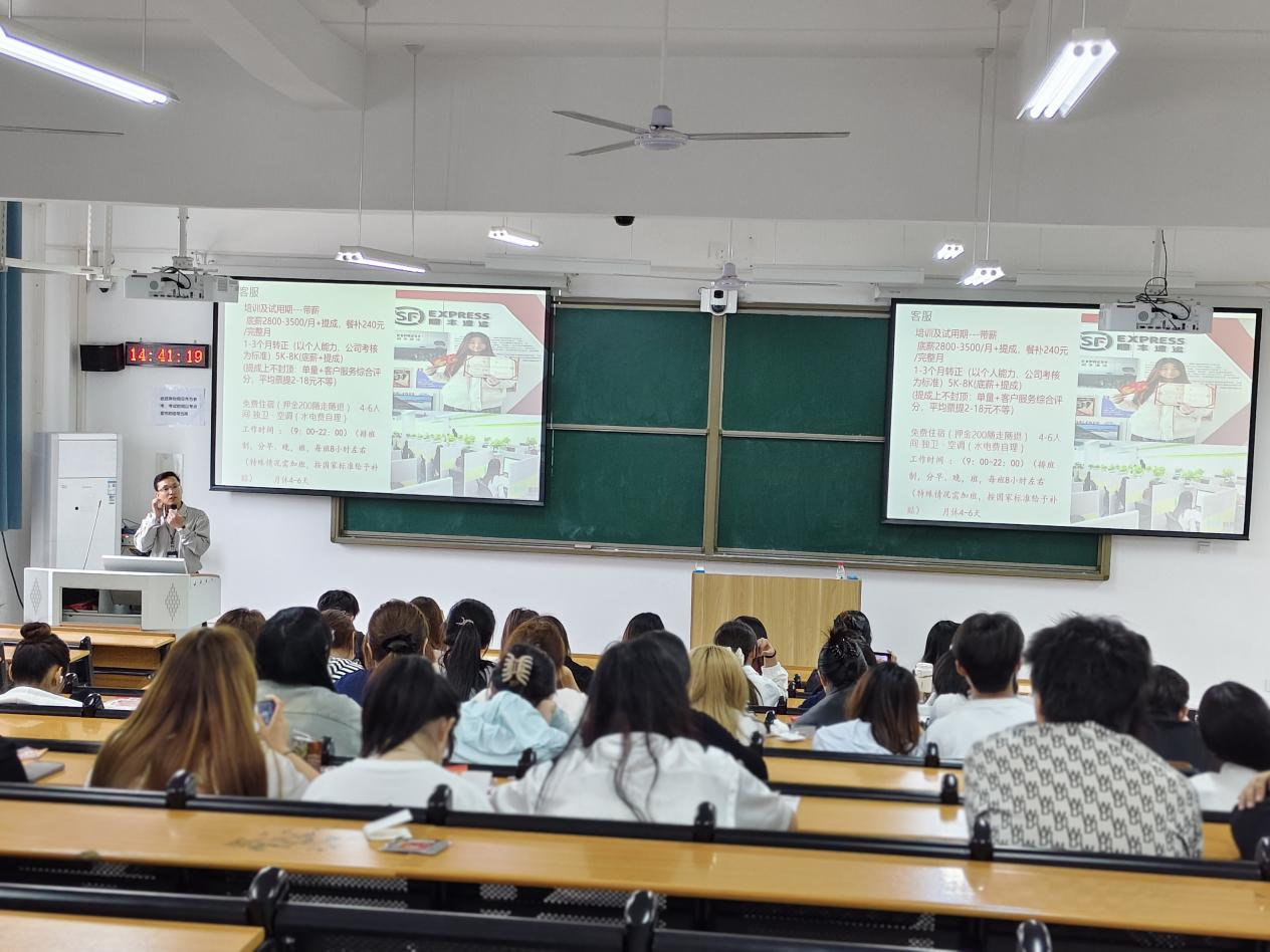宣讲会现场气氛热烈,秩序井然。各家企业招聘负责人依次登台,通过企业宣传片、PPT展示、现场答疑等方式,详细介绍了公司的发展历程、企业文化、岗位需求、薪资待遇及职业发展路径。南京优廉果业科技有限公司重点展示了生鲜电商领域的快速成长机会;上海顺城物流有限公司则强调了顺丰完善的培训体系与晋升机制;华住酒店管理有限公司围绕酒店数字化运营人才需求,向学生发出了诚挚邀请。参会企业纷纷表示,商学院学生专业基础扎实、实践能力突出,期待通过本次宣讲会吸纳更多优秀人才。